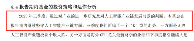 进入2023年三季度,TMT行业特别是AI赛道经历了大幅调整回撤,而作为TMT行业的基金经理,周建胜没能及时洞察到细分行业的变化,选择了依旧坚守二季度的持仓风格。在三季度中,周建胜也提到三季度继续坚守人工智能产业方向。