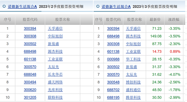 从三季度基金的前十大重仓股来看,天孚通信股价三季度以来下跌33%,中际旭创股价三季度以来下跌40%等。受到重仓个股股价下跌影响,诺德新生活混合三季度也遭遇了大幅下跌。