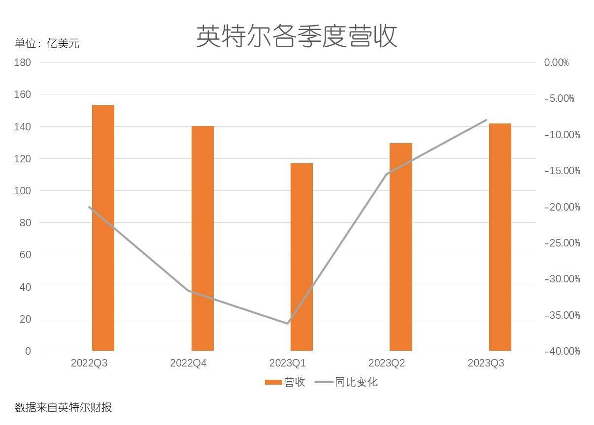 先看营收和利润的整体状况。财报显示,三季度英特尔总营收为141.6亿美元,同比下滑8%,高于市场预期的135.3亿美元;净利润则录得2.97亿美元,同比跌幅为71%。