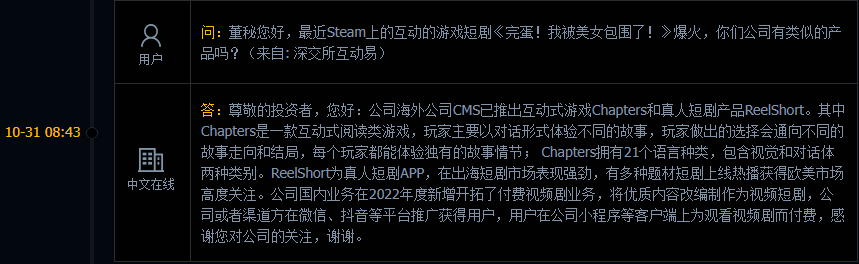 早盘中文在线一度大涨,似乎就是因为在投资者互动中表示,“公司海外公司CMs已推出互动式游戏chapters和真人短剧产品ReelShort”。