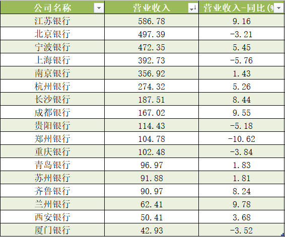 从营业收入看,前三季度营收位列前五的上市城商行为:江苏银行(586.78亿元)、北京银行(492.39亿元)、宁波银行(472.35亿元)、上海银行(392.73亿元)、南京银行(356.92亿元),这与今年上半年营收排行前五上市城商行相同。