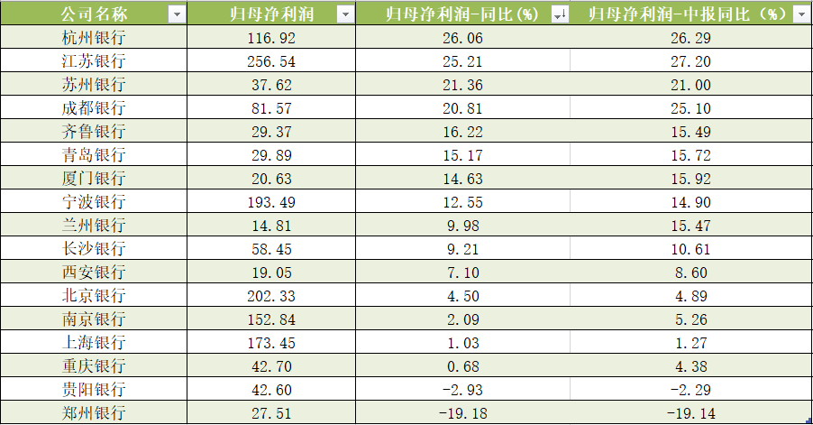 从归母净利润来看,前三季度净利同比增幅位列前五的为杭州银行、江苏银行、苏州银行、成都银行、齐鲁银行,分别为26.06%、25.21%、21.36%、20.18%、16.22%;净利润同比下降的有贵阳银行和郑州银行,分别为-2.93%和-19.18%。