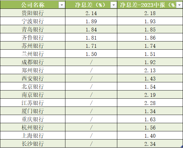 从净息差来看,17家上市城商行中仅有6家公布了三季度的净息差,分别为贵阳银行、宁波银行、青岛银行、齐鲁银行、苏州银行和兰州银行,6家上市城商行净息差较今年上半年均略有下降。