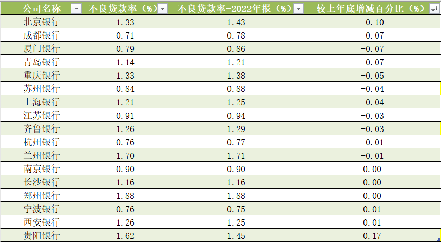 从不良率来看,7家上市城商行不良率低于1%,分别为成都银行(0.71%)、杭州银行(0.76%)、宁波银行(0.76%)、厦门银行(0.79%)、苏州银行(0.84%)、南京银行(0.90%)、江苏银行(0.91%)。不良率较上年底有所下降的上市城商行有11家。其中不良率降幅排名前五的为北京银行、成都银行、厦门银行、青岛银行、重庆银行,其中,北京银行不良贷款率较2022年底下降0.1个百分点,成都银行、厦门银行、青岛银行不良贷款率较2022年底下降0.07个百分点,重庆银行不良贷款率较上年底下降0.05个百分点;南京银行、长沙银行、郑州银行不良贷款率于上年底持平,宁波银行、西安银行、贵阳银行不良率较上年底略有抬升。