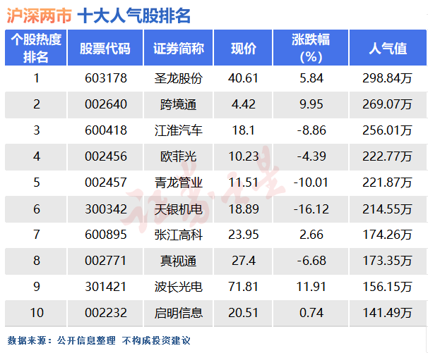 10月31日沪深两市结束了五连涨的行情,成交量回到9000亿附近。板块上煤炭、金融等板块领涨,电信、新能源板块走势较为疲软。人气股方面跨境通尾盘封板涨停,青龙管业跌停,天银机电跌超16%。下面是今日十大人气股排名的详细情况。