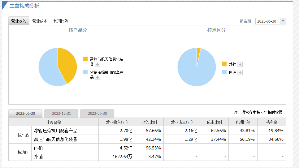 在今日大跌之前,该股涨势凌厉,一个月涨幅就超过了1倍,事实上天银机电的业务分为两块,而这巨大的涨幅主要与公司雷达与航天化装备的业务未来的想象空间有关,半年报显示,公司这部分营业收入占总收入42%,毛利率则要高出传统冰箱压缩机产品不少。