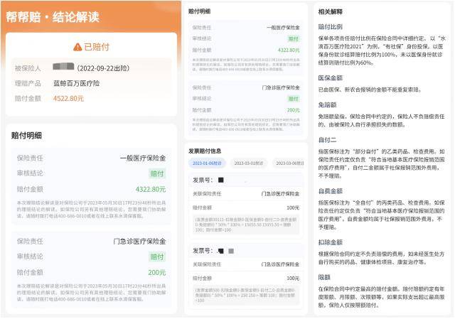 以Y先生的理赔结论解读为例,客户在页面可以清晰的看到每一项保险责任的赔付明细、每一项发票金额对应的赔付计算公式、以及相关保险专业术语的详尽解析,很大程度上能够缓解客户理赔焦虑。