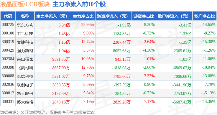 从资金流向上来看,当日液晶面板/LCD板块主力资金净流入7.53亿元,游资资金净流入9596.09万元,散户资金净流出8.49亿元。液晶面板/LCD板块个股资金流向见下表: