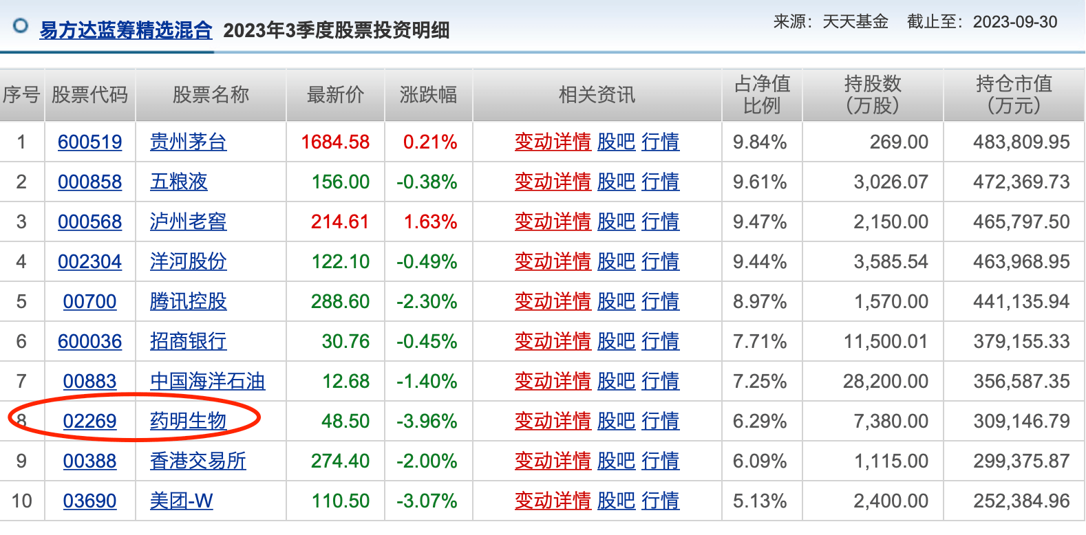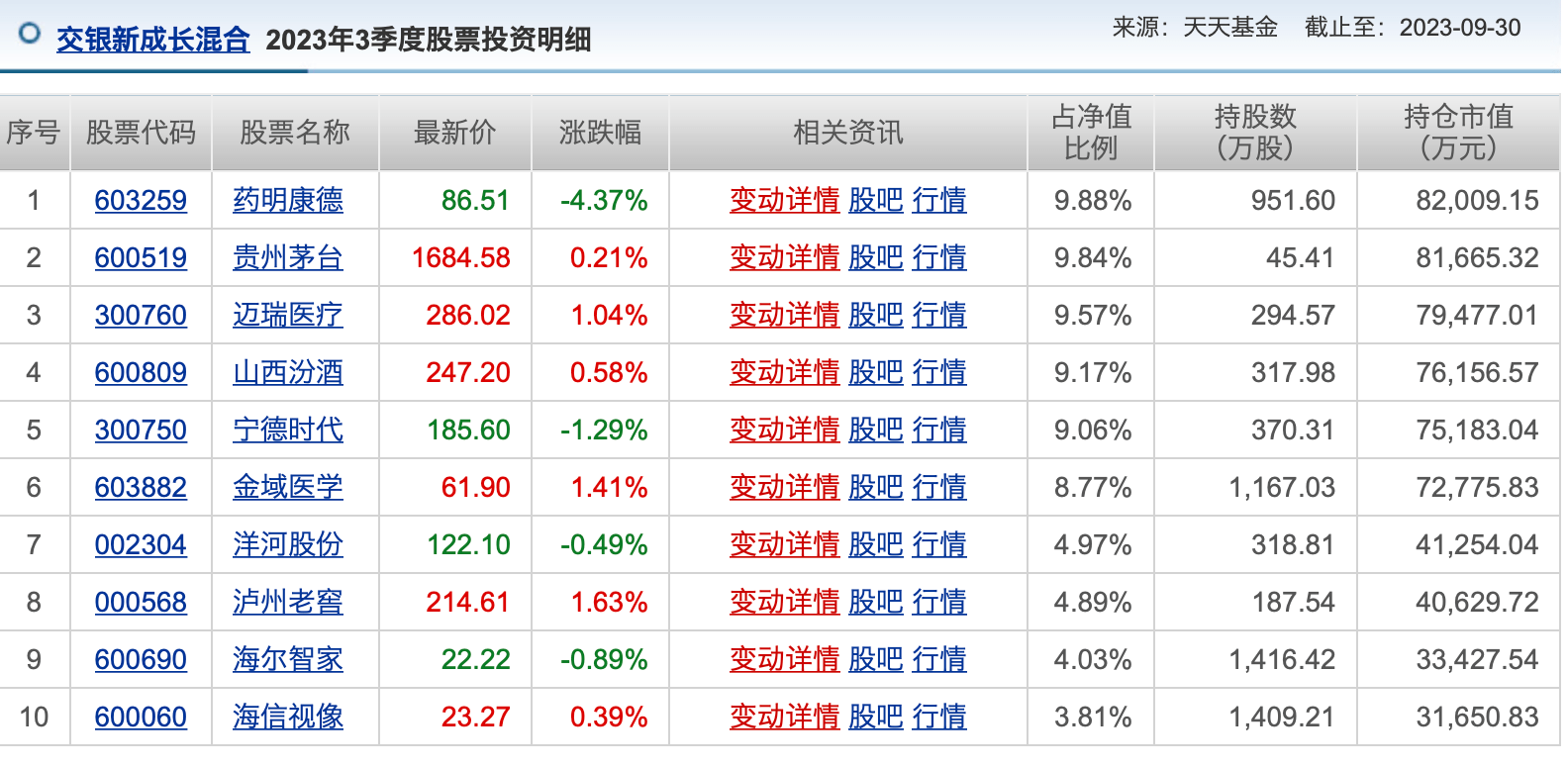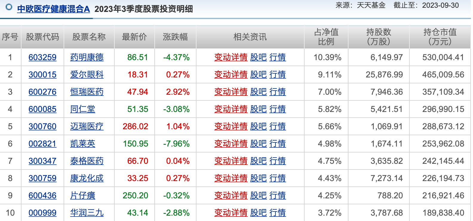 另外一个数据也值得提一提,截至三季度末,葛兰管理的中欧医疗健康混合持有药明康德6149.97万股,与二季度相比,尽管持股数量减少了200万股。但是,其持仓比例达到10.39%,且重新成为其第一大重仓股。