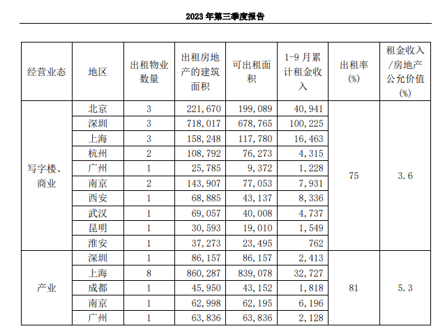 与此同时,金地的经营性物业亦为其提供了较为稳定的现金流。今年1-9月,金地的写字楼、商业及产业累计租金收入为23.17亿元。其中,写字楼、商业平均出租率75%,产业出租率为81%。