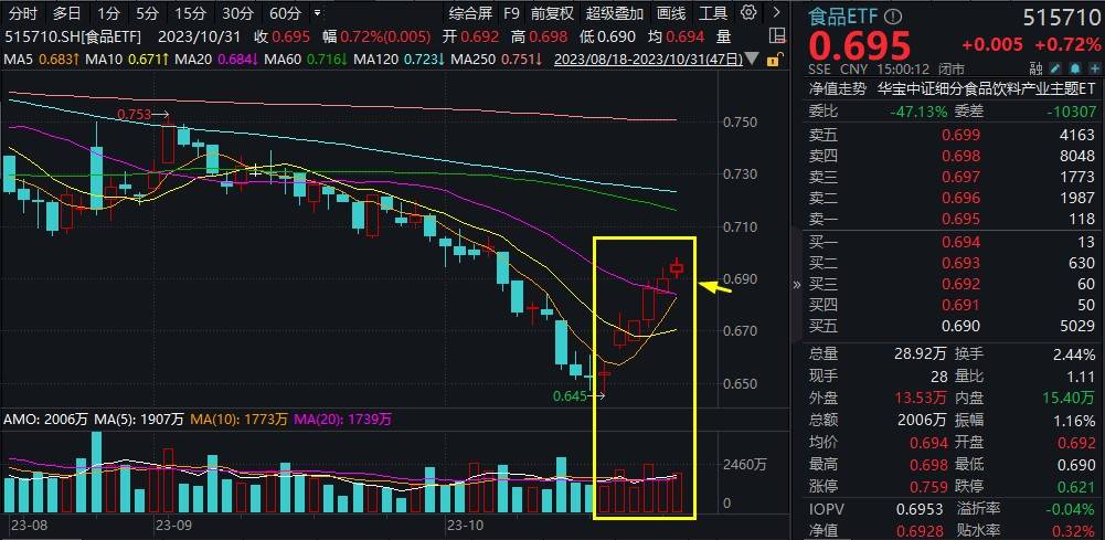 三季报密集披露以来,吃喝板块行情持续回暖,今日继续上扬,反映板块整体表现的食品ETF(515710)场内价格逆市涨0.72%,日线收出6连阳!全天成交逾2000万元,较昨日放量。