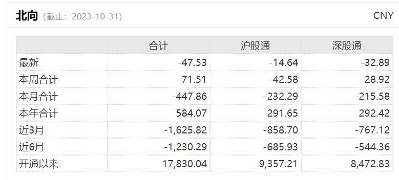 北向资金无悬念净流出,今日流出超47亿元(昨日近24亿元),对市场产生了一点影响。从年内数据看,北向资金年内净流额还有584亿元,如果11月延续流出,年内资金流入可能告负。一旦转为净流出,将会是2014年开通以来首次年度净流出。