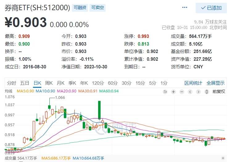 跟踪中证全指证券公司指数的券商ETF(512000)场内价格收平,全天成交额5.1亿元。