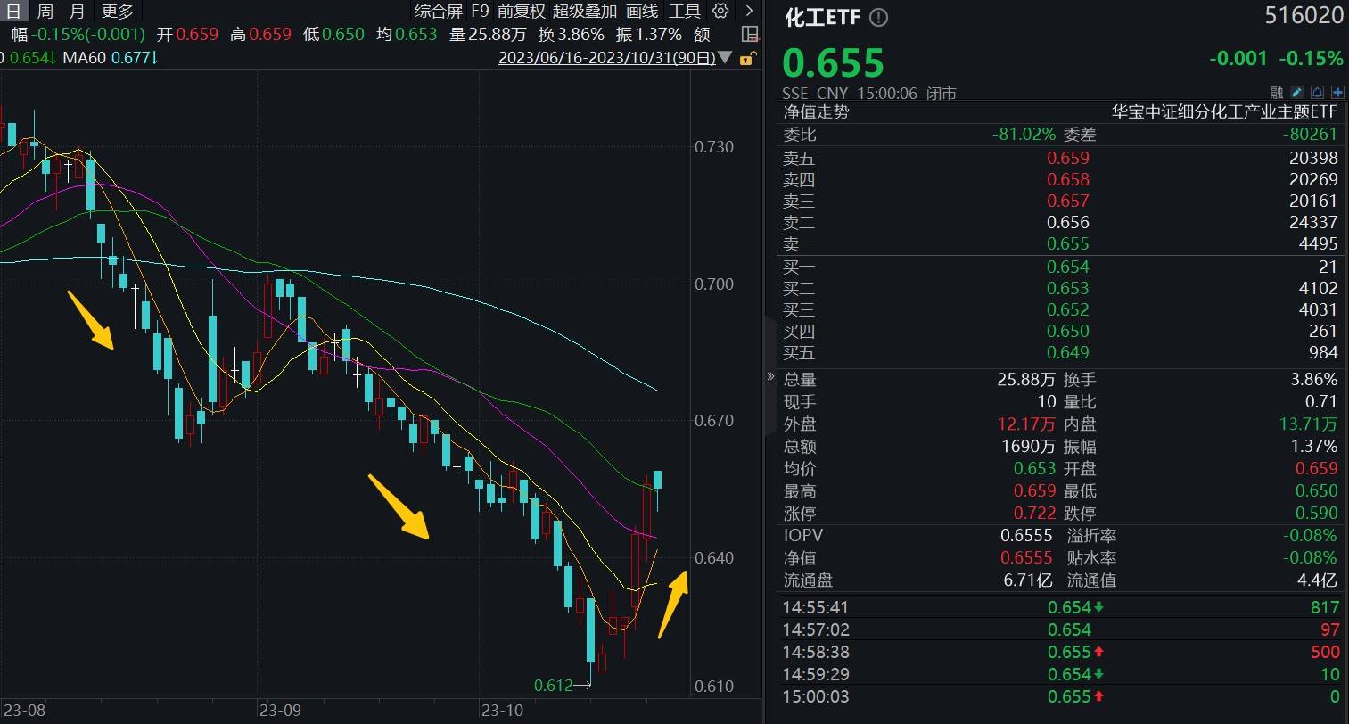 场内ETF方面,化工ETF(516020)全天维持低位震荡,尾盘跌幅收窄,场内价格最终收跌0.15%,日成交额近1700万元。自8月以来,化工板块连续三个月回调,近期连拉5根阳线,触底反弹意味较浓。