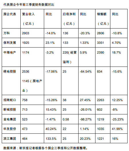 据中指研究院公布的今年前9个月百强房企销售额榜单,截至目前,销售额排名前20的房企中已有超10家房企发布了今年三季报,其中,保利发展、滨江集团、华发股份、新城控股等房企录得营收同比增长,万科、中海、招商蛇口、绿地控股、金地等房企录得营收同比下滑。