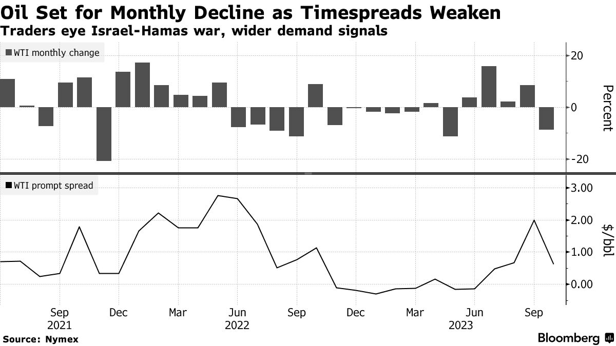 有迹象显示,以色列和哈马斯之间的战争仍将得到控制,而原油需求可能正在走软,这促使油价大幅下跌。