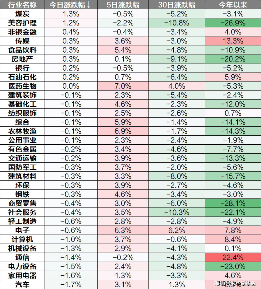 行业上来看,煤炭、美容护理、非银金融等板块领涨,汽车、家用电器、电力设备等板块下跌。