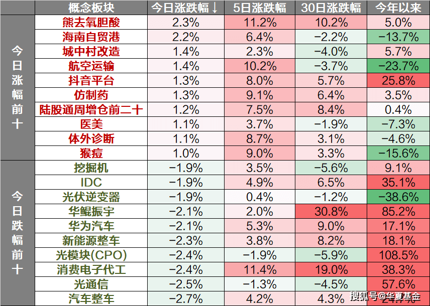 概念主题方面,熊去氧胆酸、海南自贸港、城中村改造等板块上涨,汽车整车、光通信、消费电子代工等板块下跌。