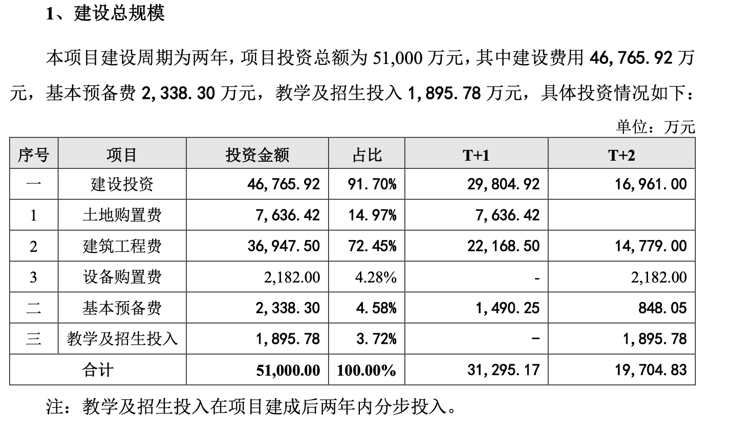 10月24日,传智教育发布可转债募集说明书,提到大同互联网职业技术学院建设项目建设期为两年,第3年开始招生,第5年达到满额,项目投资总额为5.1亿元,其中建设费用4.68亿元,基本预备费2338万元,教学及招生投入1895.78万元。