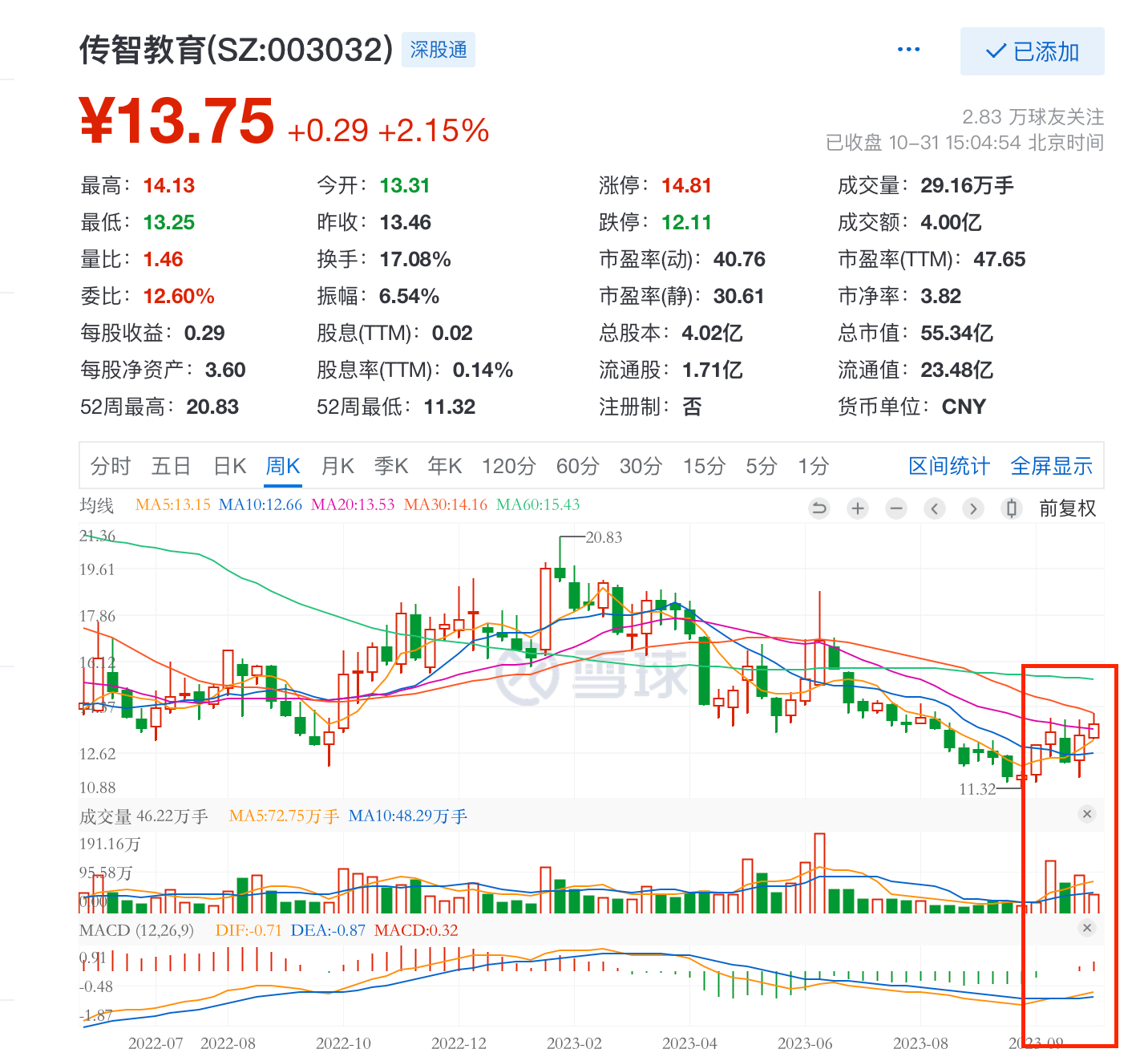 当前,公司股价上涨的趋势还在持续。截至2023年10月31日,传智教育报收13.75元/股,单日涨幅2.15%。