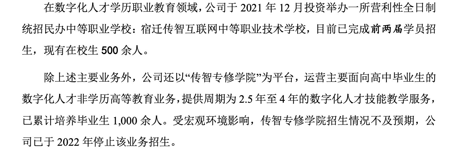 此前,传智教育曾筹建完成一所营利性全日制统招民办中等职业学校——宿迁传智互联网中等职业技术学校,开设计算机应用、大数据技术应用、网络营销与直播电商等专业,目前已完成前两届学员招生,现有在校生500余人。除此之外,公司还以“传智专修学院”为平台,运营主要面向高中毕业生的数字化人才非学历高等教育业务。不过,受宏观环境影响,传智专修学院招生情况不及预期,公司已于2022年停止该业务招生。