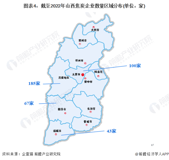 根据中国企业数据库企查猫,目前山西焦炭企业主要分布在吕梁和太原等地,截至2022年10月17日,吕梁共有相关焦炭企业数185家,太原则有100家。