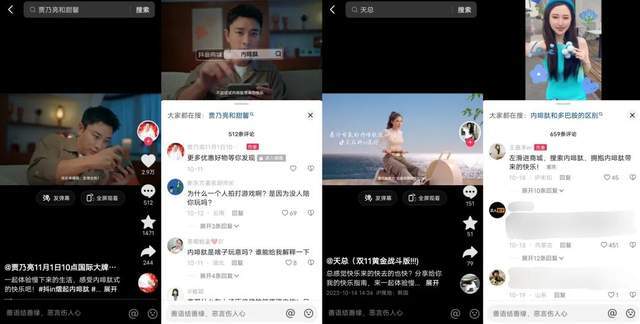搜前充分引导,提升站内外搜索总量。贾乃亮、天总、王嘉禾er等明星达人的短视频置顶评论区里增加了看后搜、猜你想要引导搜索,抖音商城的新入口-猜喜卡3、品牌馆等电商货架新资源都以充分的曝光激发了用户的搜索诉求,为品牌的下一步转化做好铺垫。