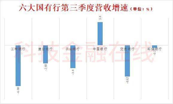 不过从第三季度看,营业收入除了中国银行,全部为下跌,工商银行下跌6.08%,建设银行下跌2.68%,农业银行下跌3.4%,交通银行下跌4.62%,邮储银行下跌0.39%,只有中国银行上涨了3.4%。