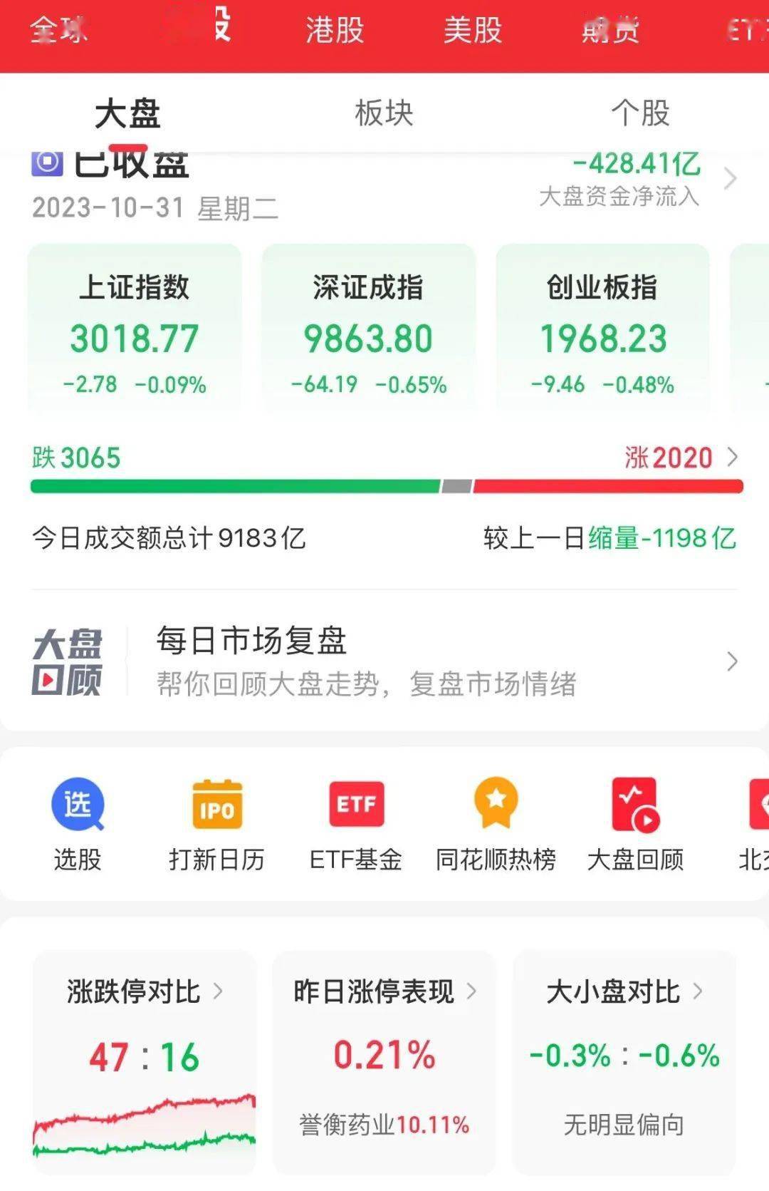 10月31日,A股三大指数飘绿收盘,个股跌多涨少,成交额较昨日减少1198亿元,北向资金净流出47.53亿元。不过,地产板块、医药板块、美容护理板块、电商板块逆市上涨。