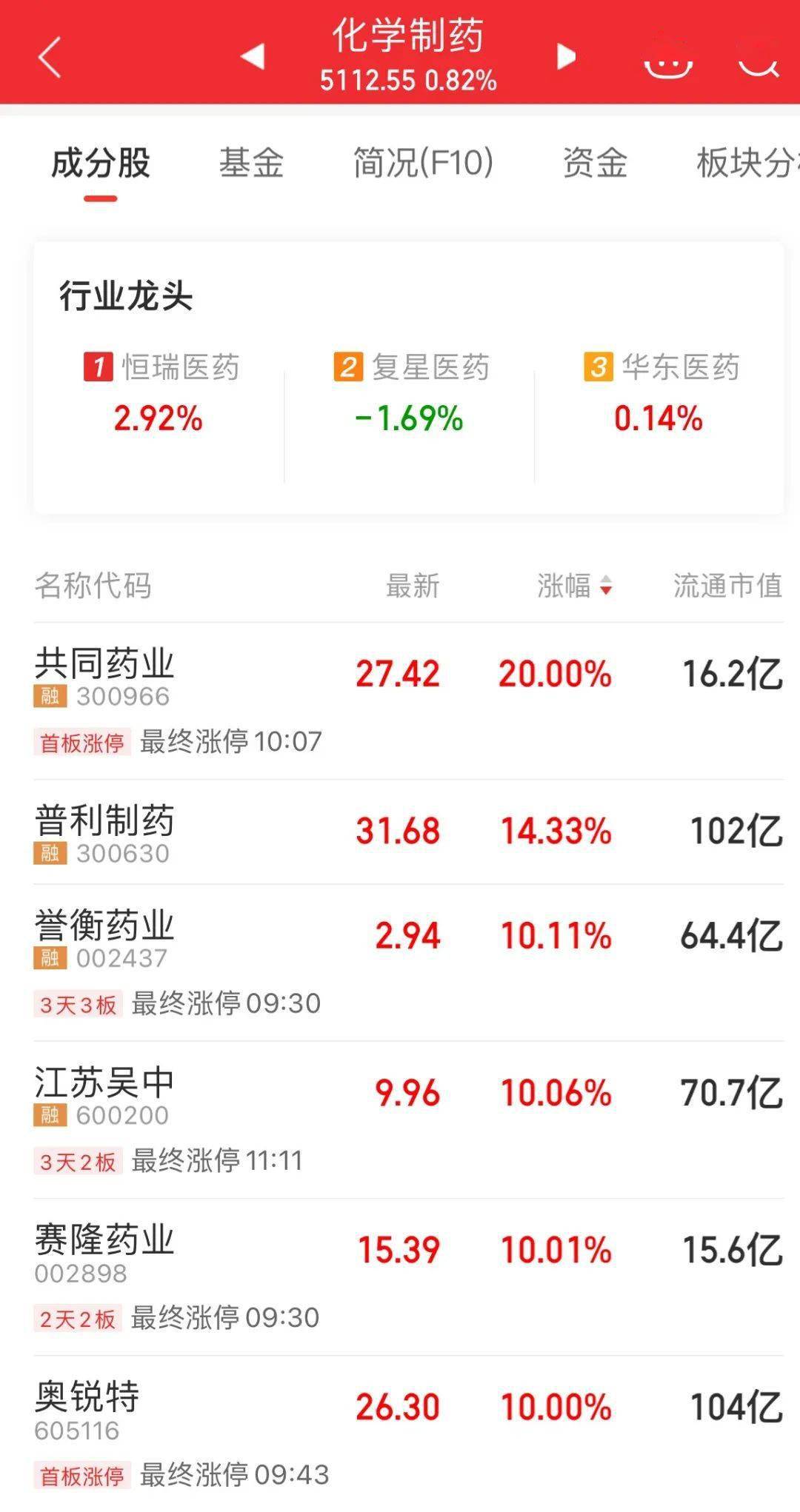 此外,医药板块延续昨日的好行情。西药、创新药概念持续活跃。共同药业以20%的涨幅涨停,普利制药、誉衡药业、江苏吴中、赛龙药业、奥锐特等跟涨。