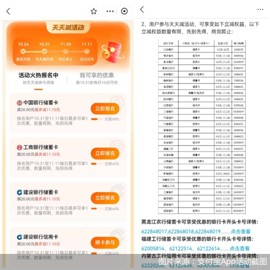 除与微信支付合作外,也有银行则选择与支付宝合作推出支付满减活动。工商银行提到,10月31日至11月11日活动期间,客户使用支付宝选择工行卡支付,参与天天减活动,支付满20元随机减0.2-11.1元。活动数量有限,工行借记卡名额为300万个,信用卡名额为140万个。
