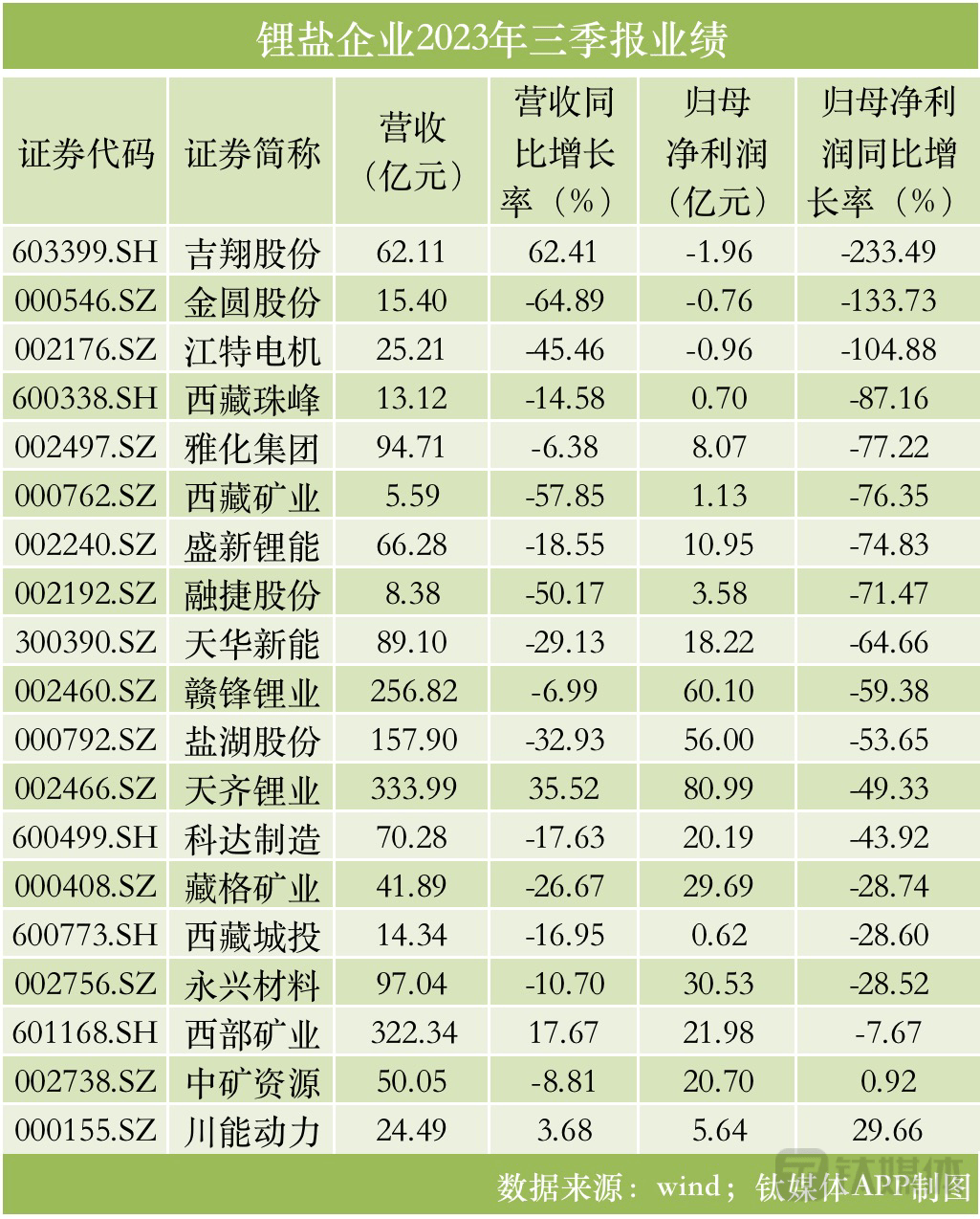 10月31日晚间,随着盐湖股份(000792.SZ)姗姗来迟的三季报披露,19家锂盐企业才悉数公告完前三季度业绩数据,其中15家营收同比下滑、17家盈利同比下滑。很明显,随着锂价大幅下挫,上游锂盐企业的赚钱能力已经大幅被削弱甚至有矿企出现亏损。