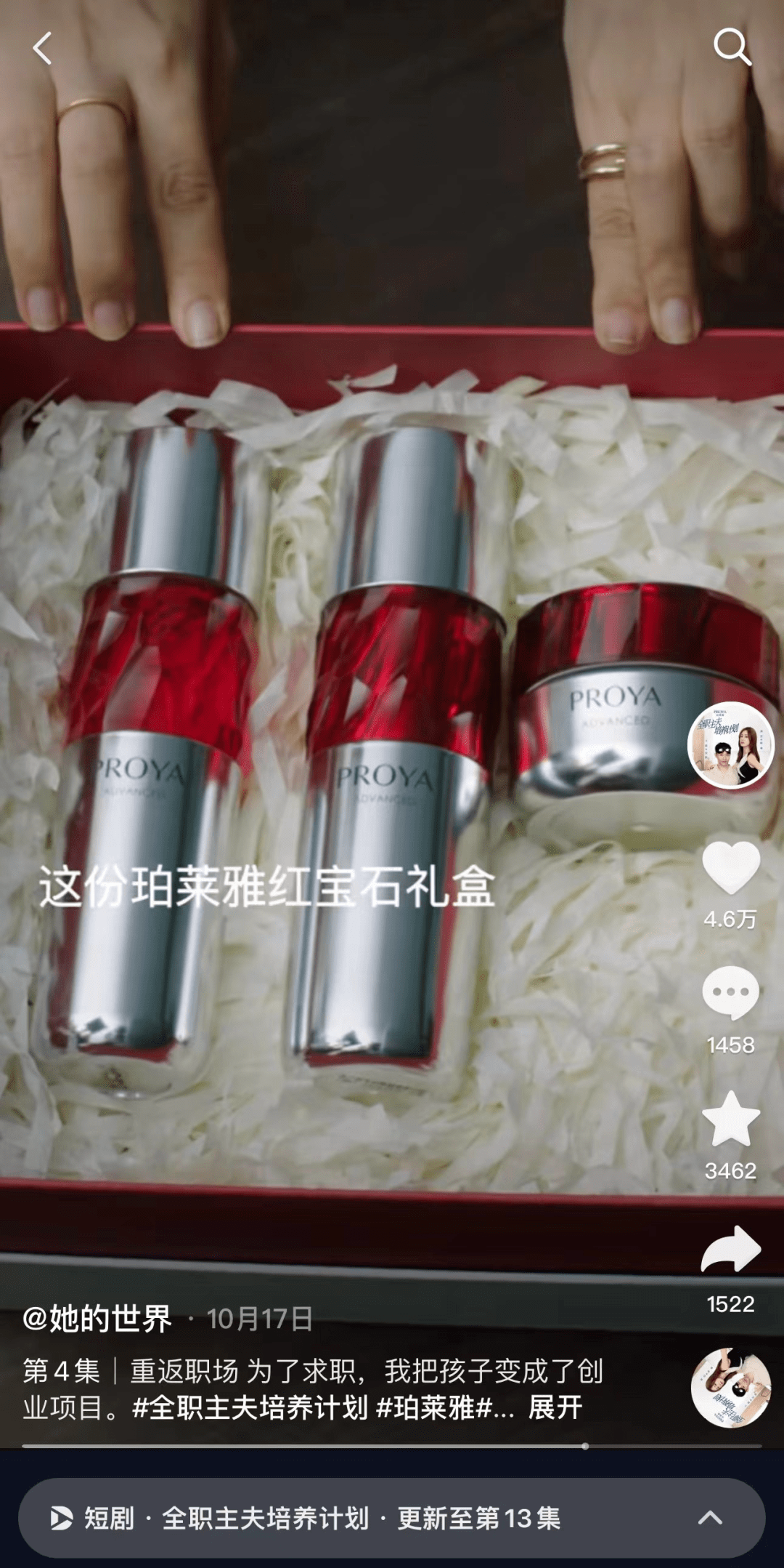《全职主夫培养计划》中品牌的露出还有,送给雌竞的同事珀莱雅红宝石礼盒作为和解礼物;把珀莱雅作为剧情中主角的合作方品牌,在汇报方案时植入珀莱雅红宝石礼盒“划定25岁以上的客户人群”、“关注女性成长”、“将品牌精神和女性自我觉醒绑定”等等理念。
