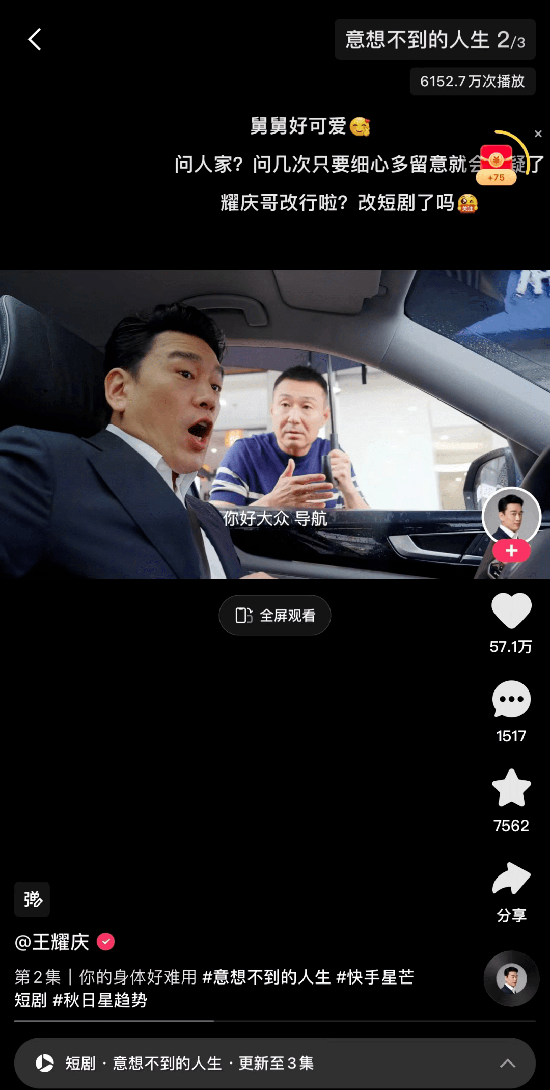 王耀庆在短剧《意想不到的人生》中再次上演霸道总裁,在一次意外中他跟一个武师互换灵魂,由此展开一段啼笑皆非的故事。剧中两人互换身份后,拥有武师灵魂的霸总忘记了上汽大众途昂V6怎么开,在其他人一步步的指导下终于找到每个部件对应的功能,通过这样的剧情,向大家展示了途昂V6的性能。