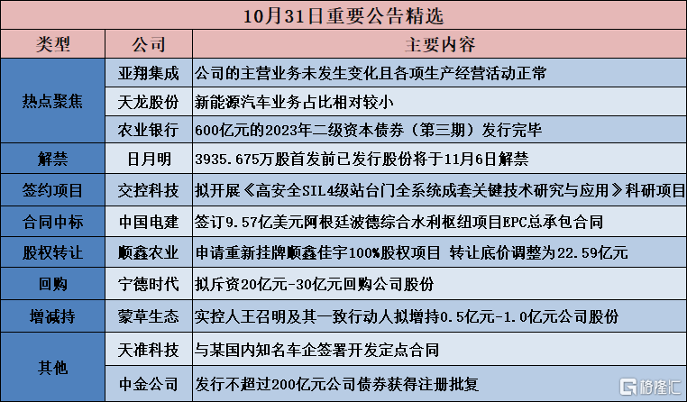 亚翔集成(603929.SH)公布,公司股票于2023年10月26日、10月27日、10月30日、10月31日连续四个交易日内收盘价格涨幅偏离值累计达到35.21%。短期内公司股价波动幅度较大;截至2023年10月31日,公司收盘价格为23.50元,根据中证指数有限公司发布的2023年10月31日证监会行业市盈率数据,公司A股静态市盈率为33.31,建筑业行业静态市盈率为7.39,同行业建筑公司平均静态市盈率为28.69,公司市盈率水平显著高于行业平均水平和同行业平均水平。