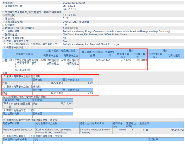 10月31日,港交所文件显示,巴菲特旗下伯克希尔·哈撒韦公司在10月25日以245.86港元的平均价格出售了比亚迪在港股上市的82.05万股股票。