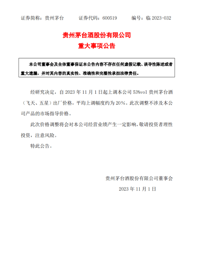 贵州茅台发布公告,经研究决定,自2023年11月1日起上调本公司53%vol贵州茅台酒(飞天、五星)出厂价格,平均上调幅度约为20%。此次调整不涉及本公司产品的市场指导价格。此次价格调整将会对公司经营业绩产生一定影响,敬请投资者理性投资,注意风险。