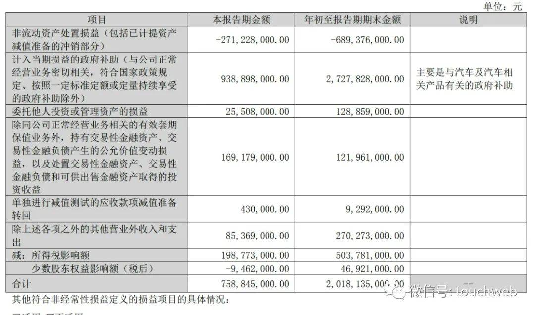 比亚迪2023年前三季度计入的政府补助为27.28亿元,其中,第三季度计入的政府补助为9.39亿元;比亚迪2023年前三季度计入的委托他人投资或管理资产的损益为1.29亿元,其中,第三季度计入2551万元。