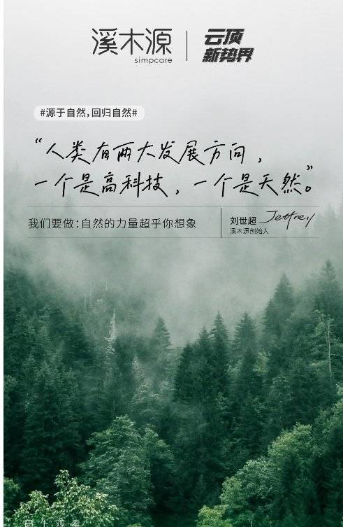 “我觉得人类就是两大发展方向,一个是高科技,一个是天然。而溪木源要做的就是‘自然的力量超乎你想象’。”这个PPT里承载的正是溪木源品牌理念的核心价值。