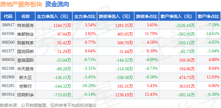 从资金流向上来看,当日房地产服务板块主力资金净流出33.31万元,游资资金净流入3040.55万元,散户资金净流出3007.24万元。房地产服务板块个股资金流向见下表: