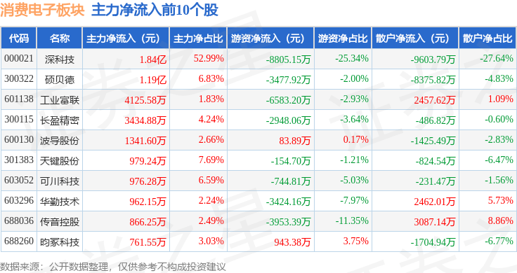 从资金流向上来看,当日消费电子板块主力资金净流出15.99亿元,游资资金净流入7590.83万元,散户资金净流入15.23亿元。消费电子板块个股资金流向见下表: