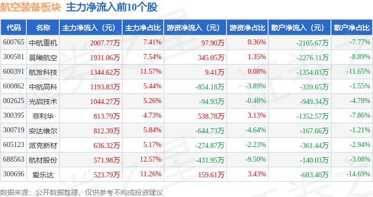 从资金流向上来看,当日航空装备板块主力资金净流出5028.61万元,游资资金净流出5052.85万元,散户资金净流入1.01亿元。航空装备板块个股资金流向见下表:
