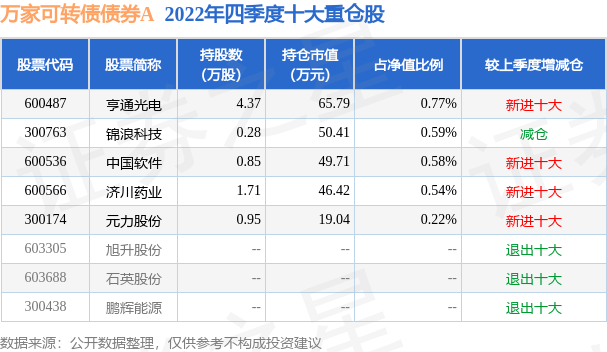 万家可转债债券A为债券型-混合一级基金,根据最新一期基金季报显示,该基金资产配置:无股票类资产,债券占净值比92.23%,现金占净值比2.25%。基金十大重仓股如下: