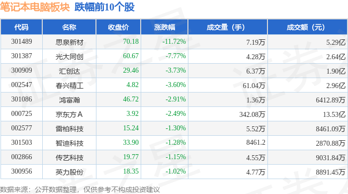 证券之星消息,10月31日笔记本电脑板块较上一交易日下跌0.65%,思泉新材领跌。当日上证指数报收于3018.77,下跌0.09%。深证成指报收于9863.8,下跌0.65%。笔记本电脑板块个股涨跌见下表: