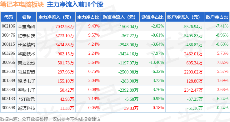 从资金流向上来看,当日笔记本电脑板块主力资金净流出3.15亿元,游资资金净流出1.1亿元,散户资金净流入4.25亿元。笔记本电脑板块个股资金流向见下表: