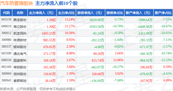从资金流向上来看,当日汽车热管理板块主力资金净流出2.54亿元,游资资金净流出3679.35万元,散户资金净流入2.91亿元。汽车热管理板块个股资金流向见下表:
