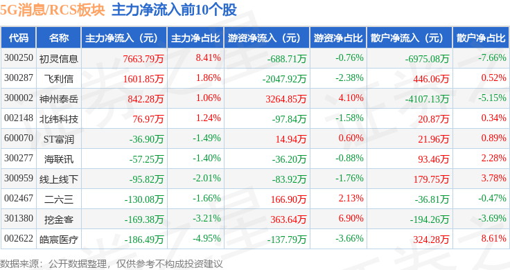从资金流向上来看,当日5G消息/RCS板块主力资金净流出7.9亿元,游资资金净流入1.88亿元,散户资金净流入6.02亿元。5G消息/RCS板块个股资金流向见下表: