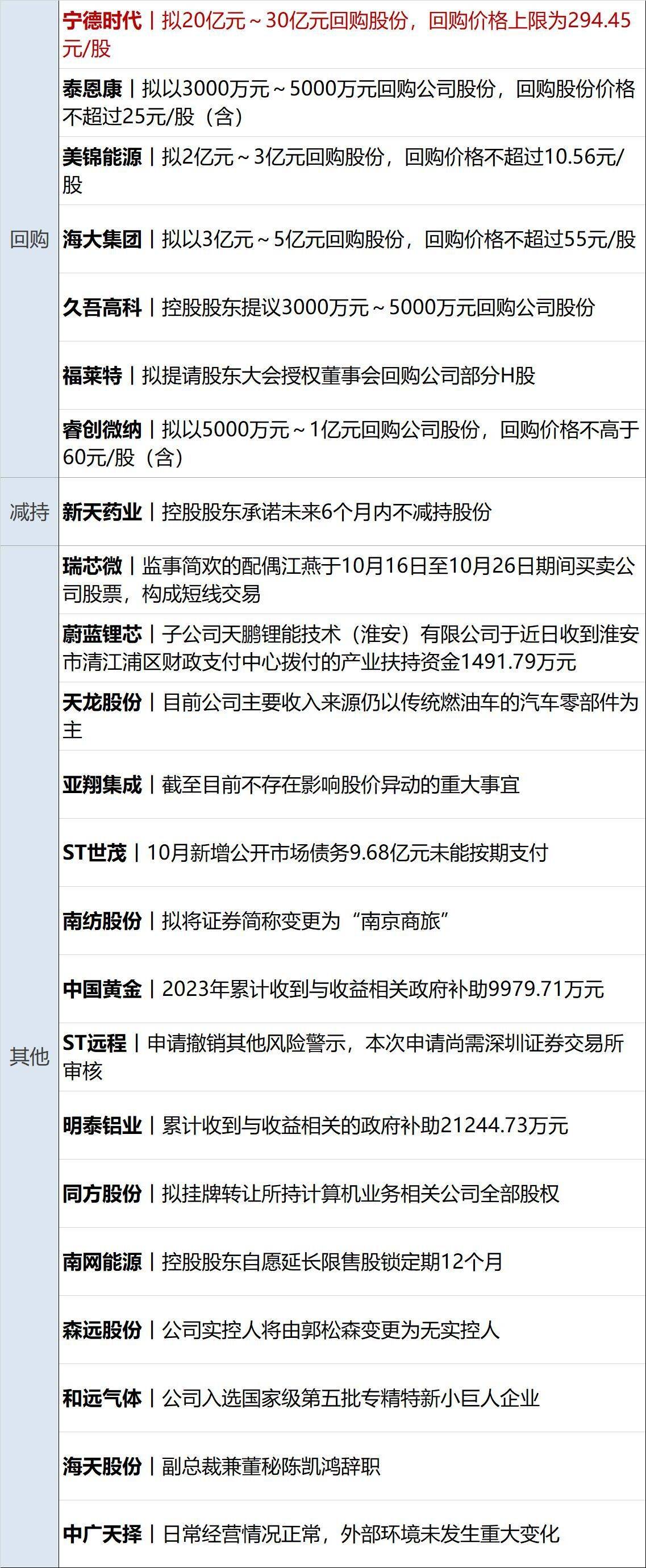 NO.5宁德时代(SZ300750,股价185.6元,市值8161.25亿元):10月31日,宁德时代(300750)晚间公告,公司拟以20亿元-30亿元回购股份,用于实施股权激励计划或员工持股计划,回购价格上限为294.45元/股。