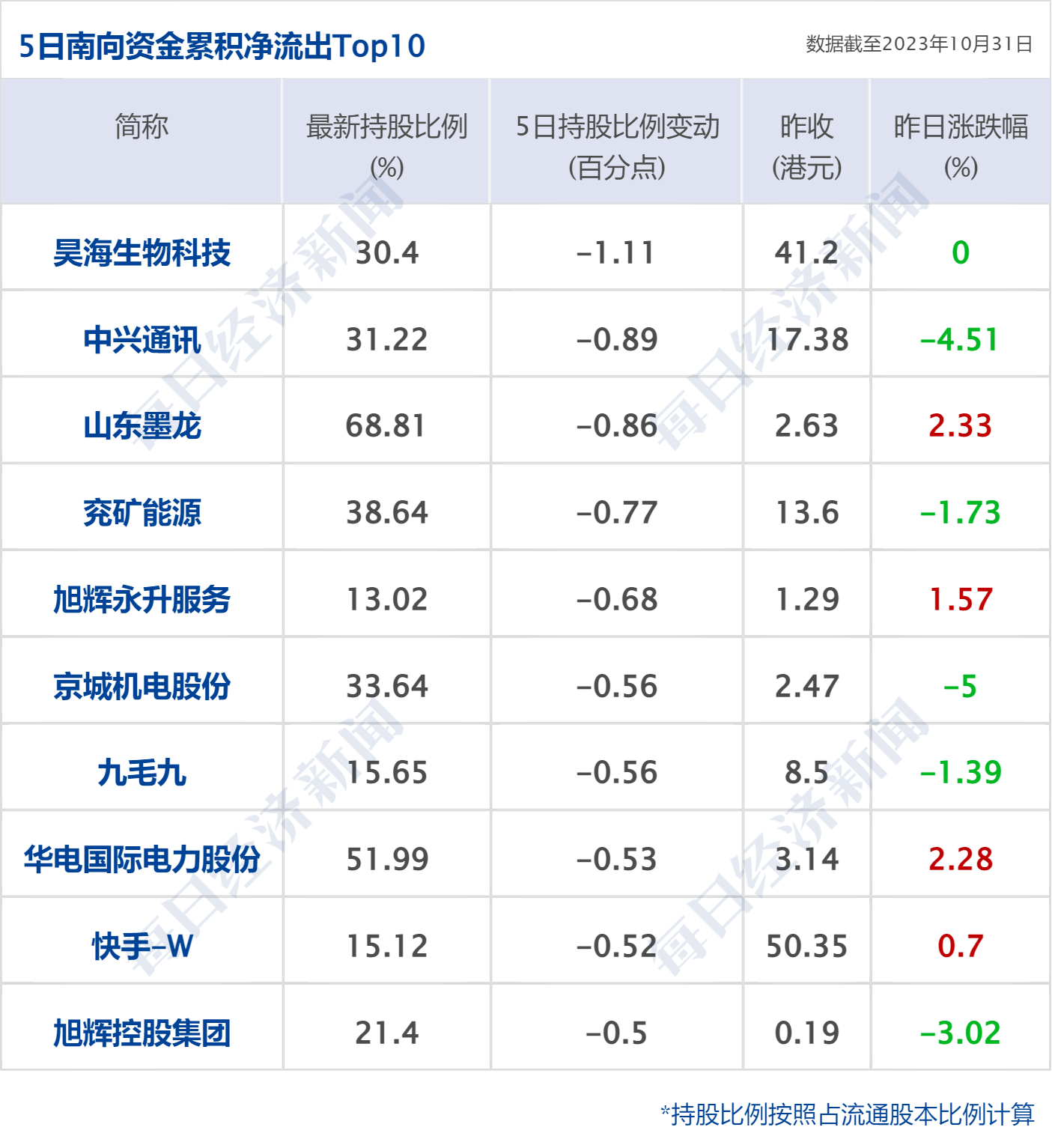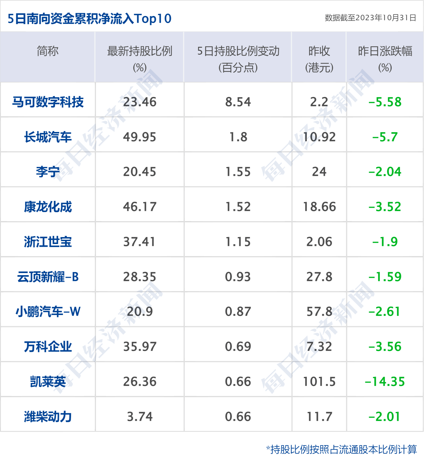 10月31日,南向资金净买入19.35亿港元。南向资金成交活跃个股榜单中,净买入个股共10只,金额最多的是美团-W(3690.HK,收盘价:110.6港元),净买入2.047亿港元;净卖出个股共5只,金额最多的是腾讯控股(0700.HK,收盘价:289.2港元),净卖出2.683亿港元。