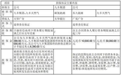 就上述授信事项,公司与大华广分、九丰集团与大华银行签署了相关担保合同,公司为九丰集团、九丰天然气提供连带责任保证担保美元6,390.00万元,九丰集团为碳氢能源提供连带责任保证担保美元6,000.00万元,且公司与九丰集团提供的担保总额合计不超过美元6,390.00万元;公司与广发银行签署了担保合同,公司分别为东九能源、九丰天然气向广发银行提供人民币10,000.00万元、30,000.00万元的连带责任保证担保。